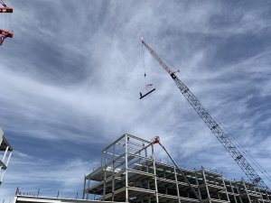 Also in true topping out fashion, an evergreen tree was attached to the beam as it was hoisted to the top of the building’s structure. The small evergreen tree (known as topping trees) symbolizes many things: